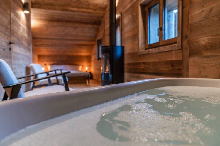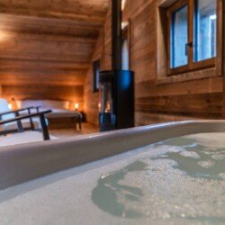 L’espace bien-être comprend un sauna, un spa et un coin détente pour un moment de relaxation absolue. Vous trouverez également une cave à vin, une télévision escamotable, ainsi qu’un espace extérieur avec vue imprenable sur la vallée.